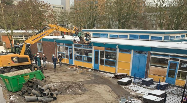 Wethouder Bloemhoff verrichtte vanmorgen de start sloop van de Bisschop Bekkerschool aan de Siriusstraat in de Groninger wijk Paddepoel.
