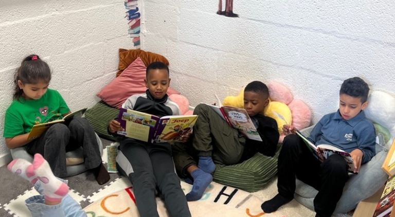 Sssst… wel even stil hoor! In groep 4 is er tegenwoordig een leeshoek. Heb je die al gezien? In deze gezellige hoek kunnen de kinderen, net als thuis, heerlijk ontspannen boeken lezen.